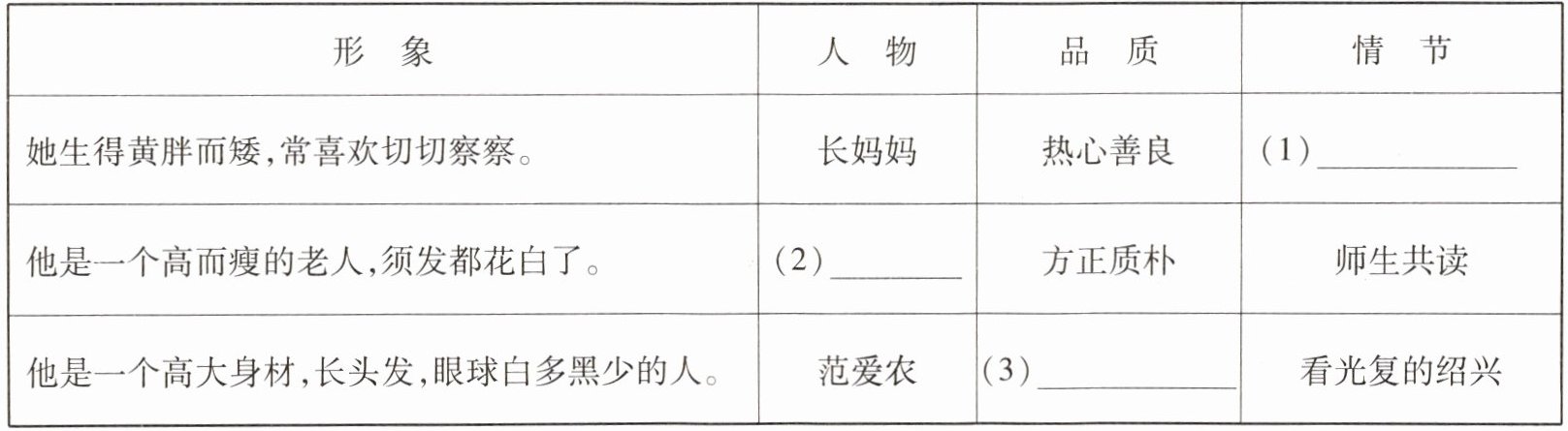 3. (2024·广元中考)在《朝花夕拾》中,鲁迅擅长用颜色来描写人物,文中各“色”小人物身上,处处透露出人性的光辉,彰显着中国人的本色。请根据你的阅读体验,填写人物档案。
