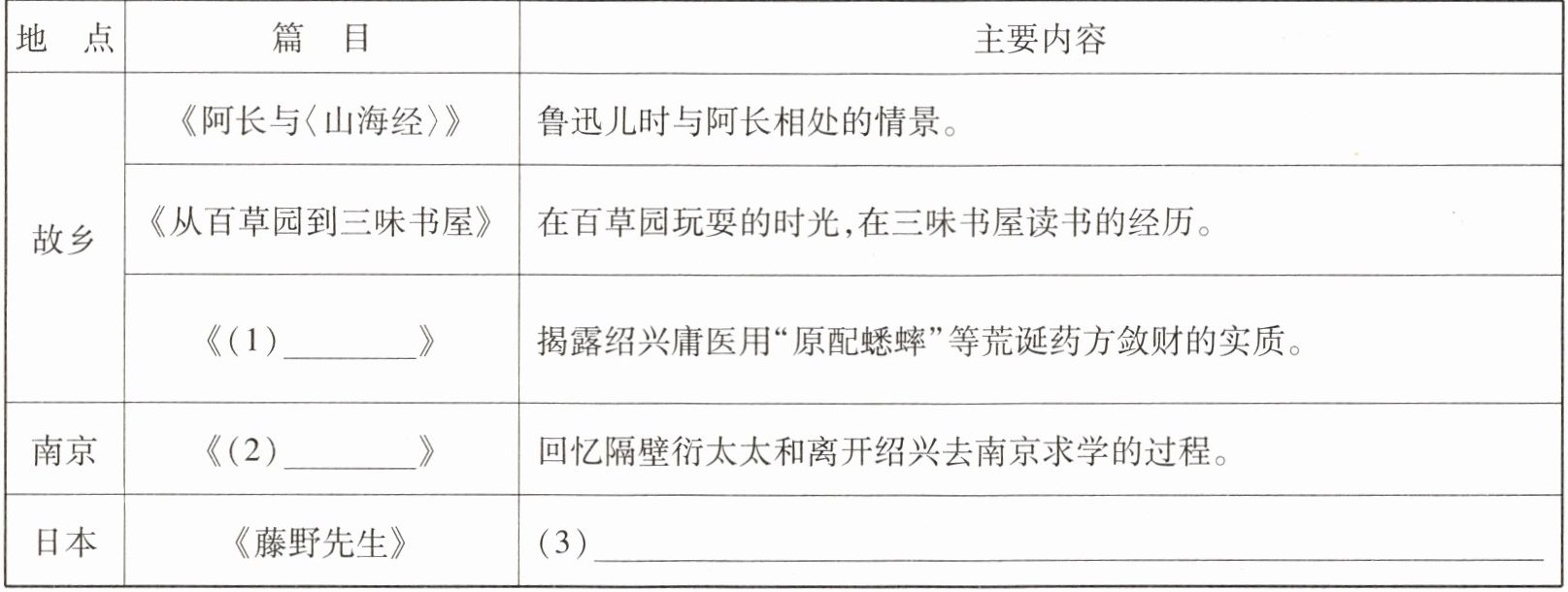 1. 《朝花夕拾》里有鲁迅从少年到青年的成长轨迹,请你根据地点的转换,完成下面表格。