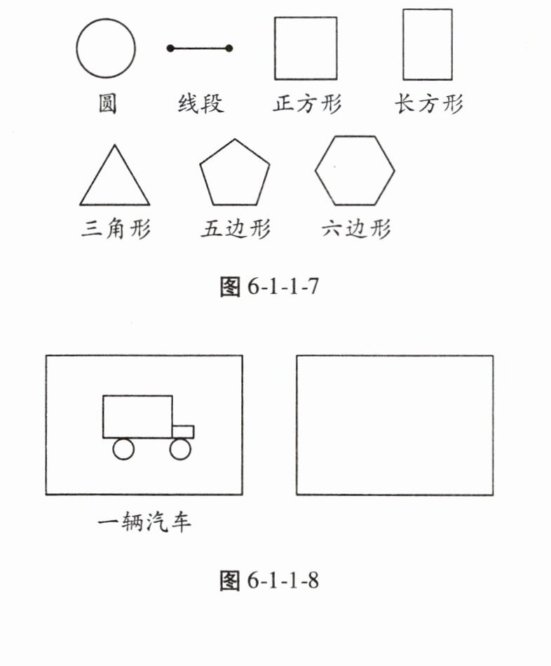 10. 如图6-1-1-7,有7种图形,请你选用这7种图形中的若干种(不少于两种)构造一幅画,并用一句话说明你的构想是什么。举例:如图6-1-1-8,左框中就是一个符合要求的图案,请你在右框中画出一个与这个不同的图案,并加以说明。