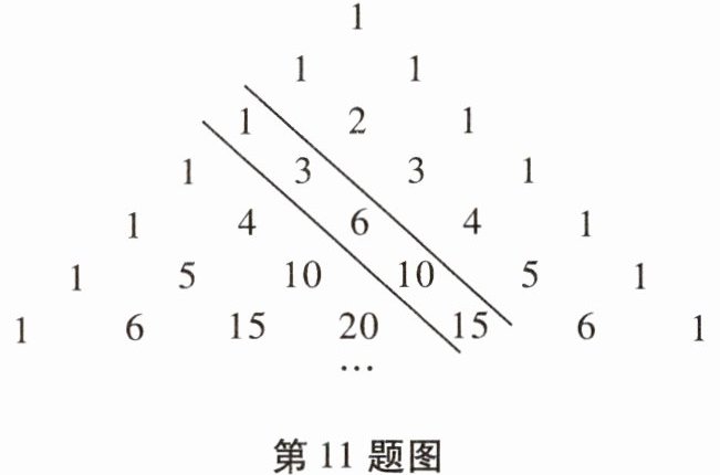 11. 我国古代数学家杨辉在《详解九章算法》一书中辑录了如图所示的三角形,后人称它为“杨辉三角”。它具有一定的规律性,从图中取一斜列数:$1,3,6,10,15$,我们把第一个数记为$a_{1}$,第二个数记为$a_{2}$,第三个数记为$a_{3},……第n个数记为a_{n}$,则$a_{n}$为