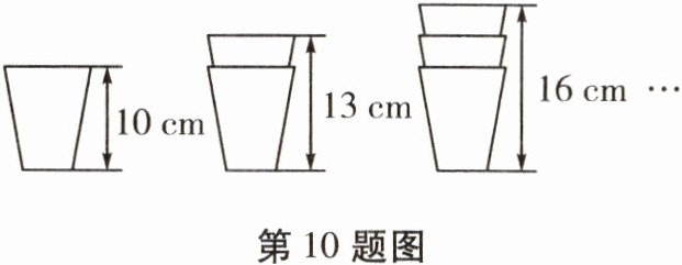 10. 有一种塑料杯子的高度是$10\ cm$,两个以及三个这种杯子叠放时高度如图所示,第$n$个这种杯子叠放在一起的高度是