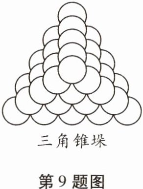 9. 古希腊毕达哥拉斯学派的“三角形数”是一列点(或圆球)在等距的排列下可以形成正三角形的数,如$1,3,6,10,15,……$我国宋元时期数学家朱世杰在《四元玉鉴》中所记载的“垛积术”其中的“落一形”堆垛就是每层为“三角形数”的三角锥的锥垛(如图,顶上一层$1$个球,下一层$3$个球,再下一层$6个球……$),若一个“落一形”三角锥垛有$10$层,则该堆垛第$n$层球的个数为(