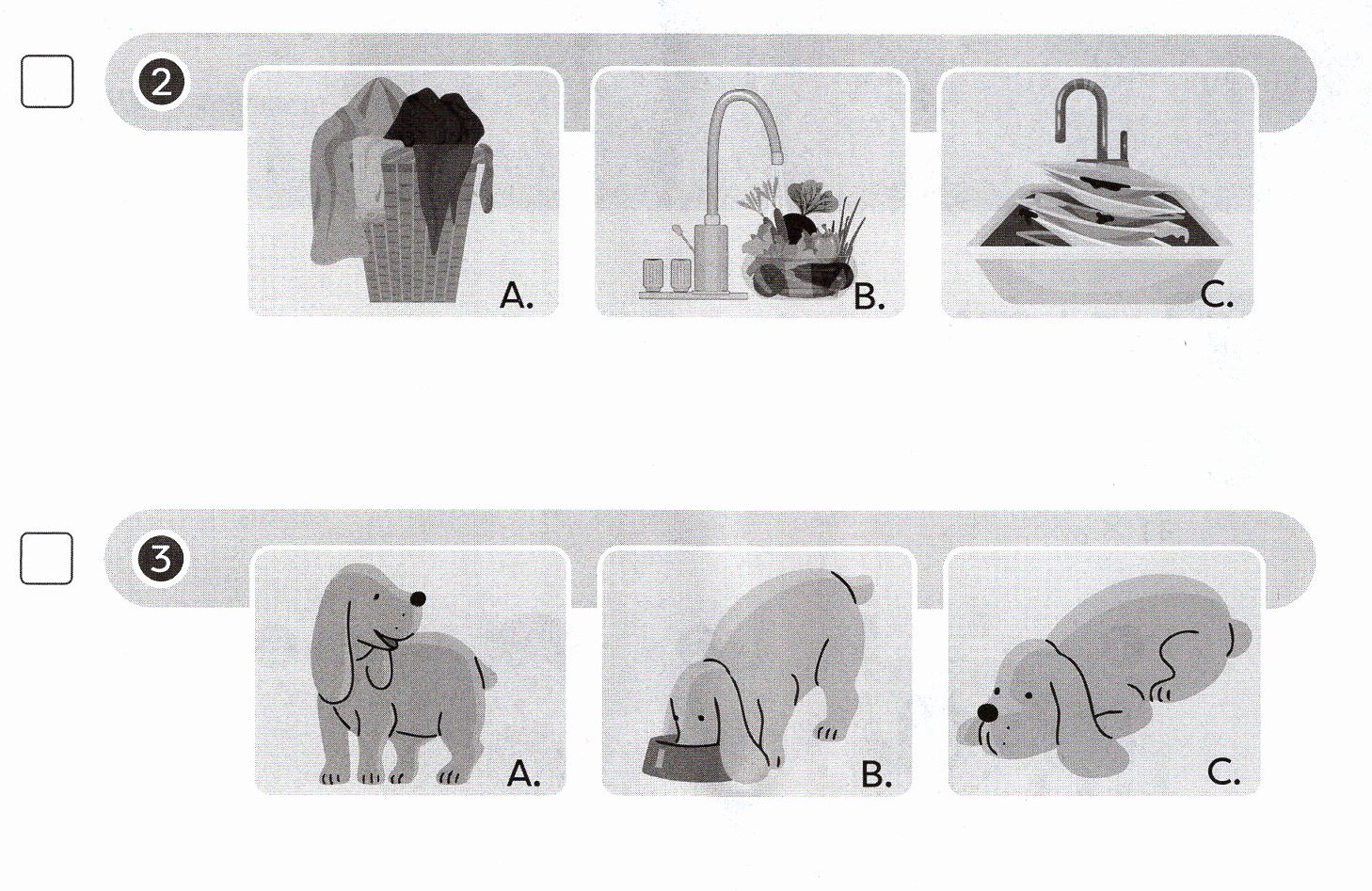 1 听句子,判断图片正误。在正确的图片下打√,在错误的图片下打×。
