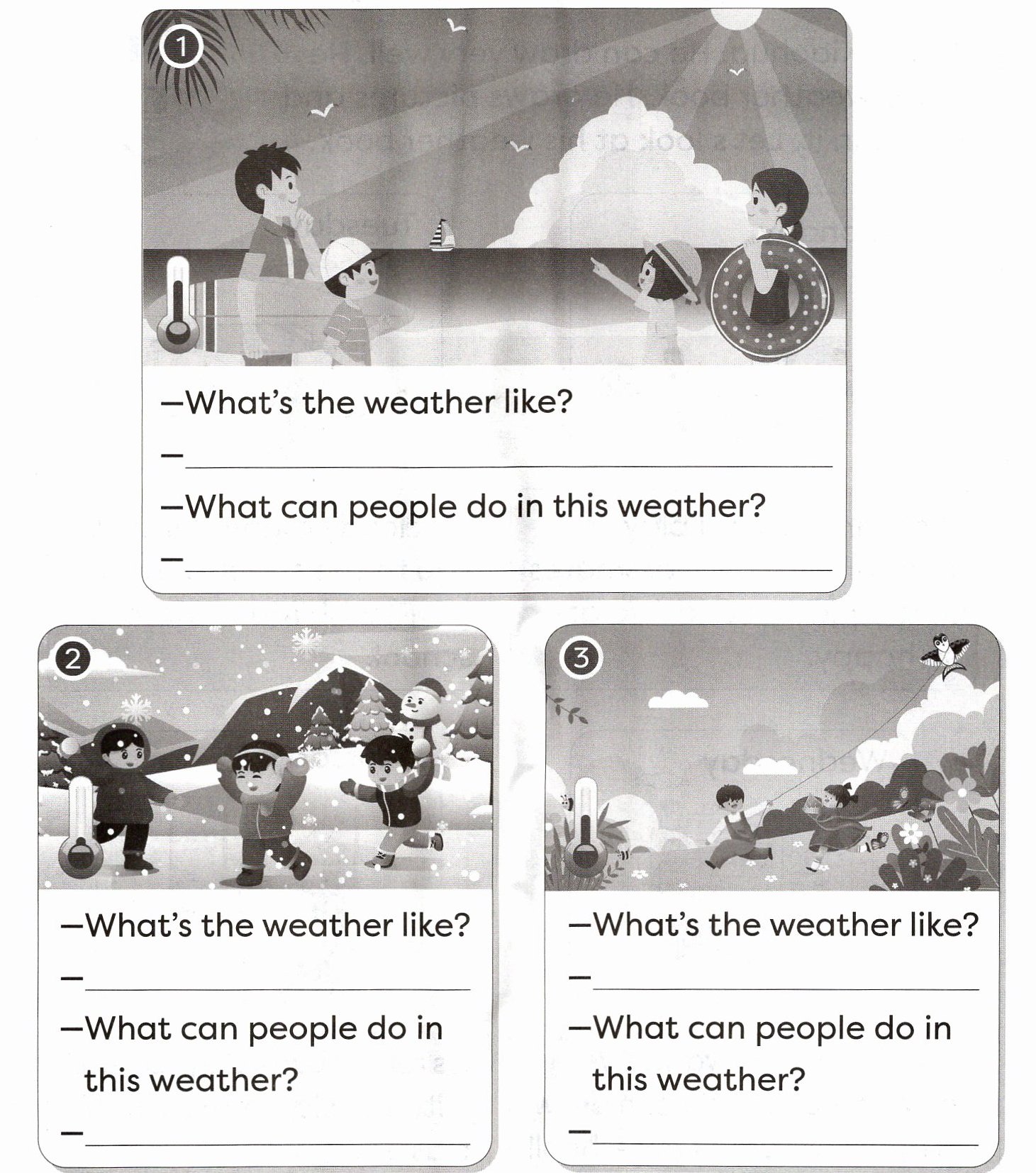 ① It's sunny and hot. They can go to the beach. ② It's snowy and cold. They can play in the snow. ③ It's windy and cool. They can fly kites.