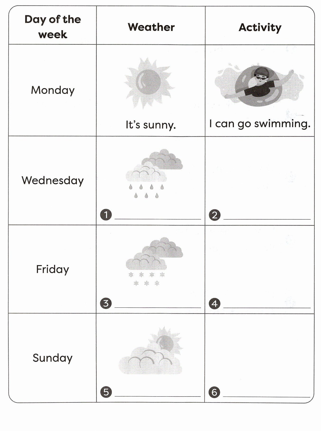 1. It's rainy. 2. I can read books. 3. It's snowy. 4. I can make a snowman. 5. It's cloudy. 6. I can fly a kite.