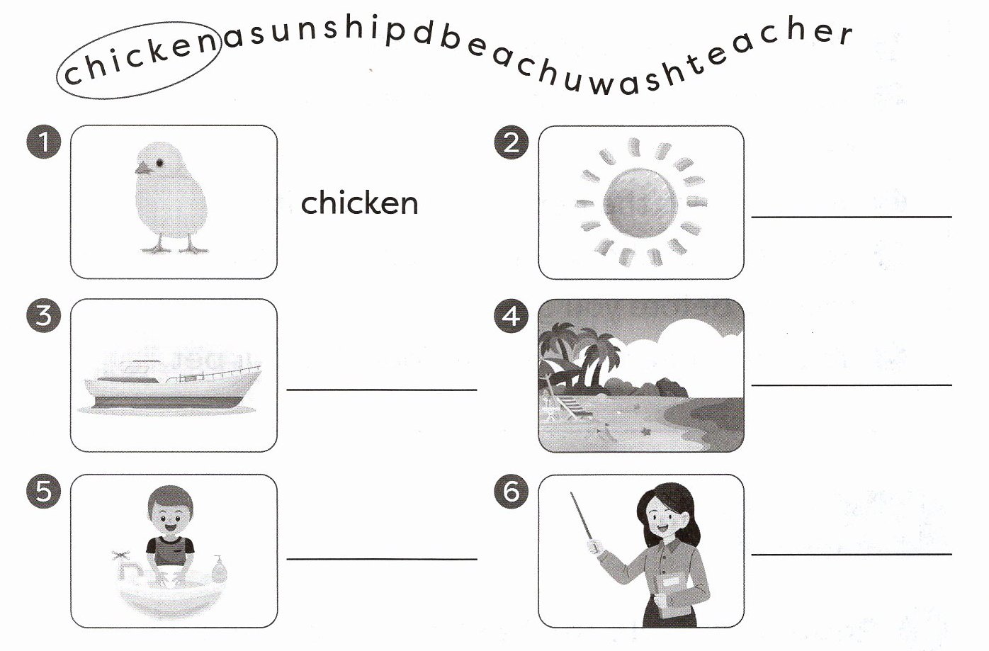 2 chicken 3 ship 4 beach 5 wash 6 teacher