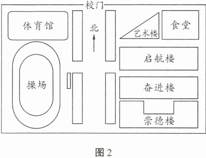 4. (2024·榆林阶段练)【核心素养·地理实践力】陕西某校为了让七年级新生熟悉校园,决定开展以“我的学校”为主题的地图绘制活动。为此,学生以小组形式分别对学校的各个建筑、绿地、活动场所等进行位置测量、数据收集整理,并绘制了学校平面示意图(图 2)。据此完成下列问题。