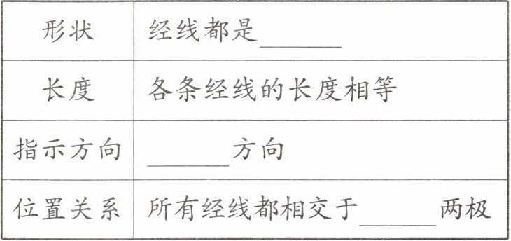 5. 填表 2 - 1 - 3,描述经线的特点。