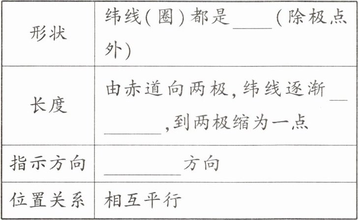 1. 填表 2 - 1 - 2,描述纬线的特点。