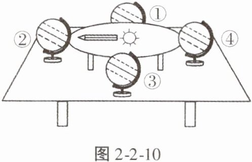 (2024·西安模拟预测)【核心素养·地理实践力】地理课堂上,学生自制模型演示地球运动。椭圆形纸板代表地球公转轨道平面,铅笔代表太阳直射光线。演示时,学生手持地球仪沿椭圆纸板边缘转动。读地球运动演示图(图 2 - 2 - 10),完成 9、10 题。