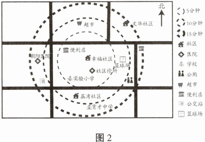 (2024·山西中考)“15分钟便民生活圈”是以社区为中心,市民步行直线距离仅需15分钟即可享受购物、社交、文化、休闲、医疗、健身、教育等多种便民服务。图2示意幸福社区“15分钟便民生活圈”,读图完成3—5题。