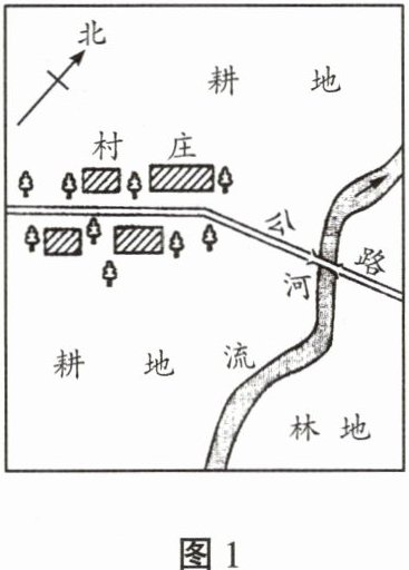 (2024·新疆中考)某校地理社团到M村考察时,看到了如图1所示的平面图。读图完成1、2题。
