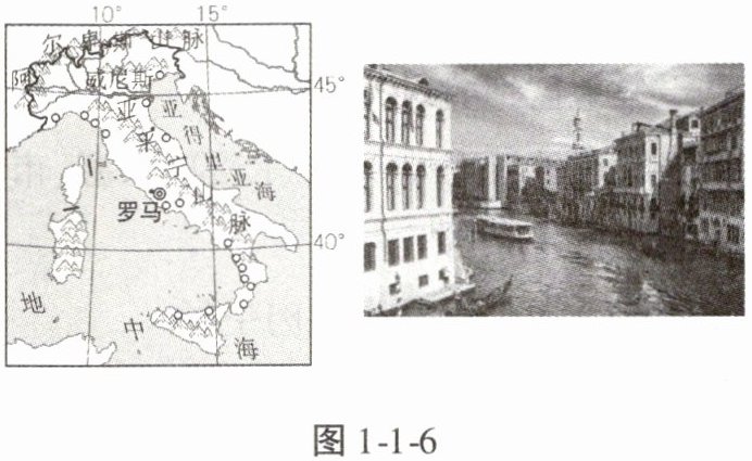 意大利“水城”威尼斯有着“因水而生,因水而美,因水而兴”的美誉。全城 400 多座各式桥梁连接着 100 多条纵横交错的大小河道。城内没有汽车和自行车,也不见交通指挥灯,船是城市里唯一的交通工具。图 1-1-6 示意意大利地形分布及威尼斯景观。读图完成 5、6 题。