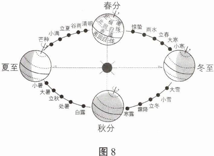 13. (2024·渭南期中)【新考法·素材跨语文】二十四节气是上古农耕文明的产物,它是上古先民顺应农时,通过观察天体运行所形成的指导生活的知识体系。中国诗词歌谣对时节和气候丰富细腻的描述堪称二十四节气的“文学说明书”。读二十四节气在地球公转轨道上的位置示意图(图8),完成下列问题。