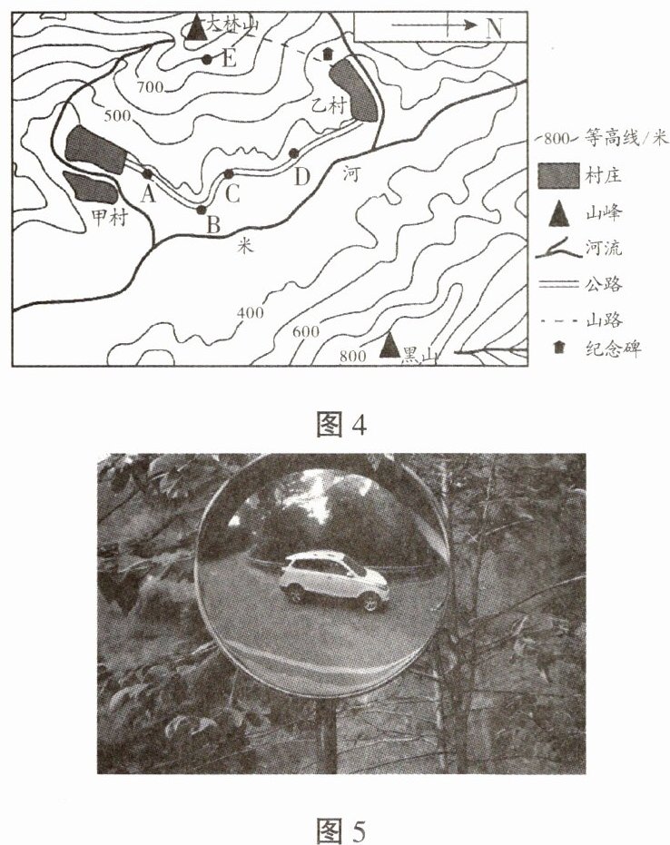 【生活情境】凸面镜以凸面成像,在驾驶员视线受阻时,可借助凸面镜观察对向车辆行驶情况,主要用于各种弯道、路口,它可以有效提升行车安全。读某地等高线地形图(图4)和凸面镜示意图(图5),完成7、8题。