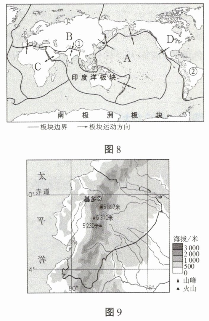 12. 【核心素养·综合思维】北京时间2023年3月19日1时12分,厄瓜多尔发生6.7级地震。读世界板块分布示意图(图8)和厄瓜多尔简图(图9),完成下列问题。