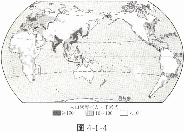 读世界人口密度分布图(图 4 - 1 - 4),完成 3—5 题。