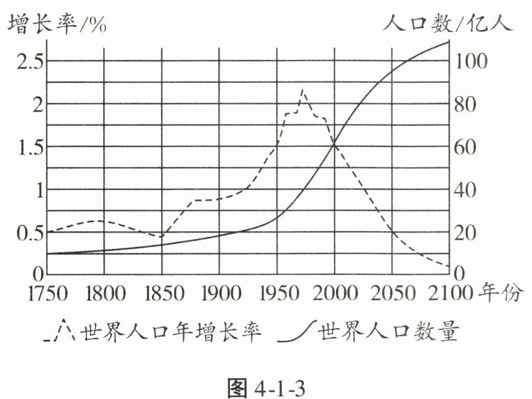 (2025·河南中考)目前,世界人口已经突破 80 亿!图 4 - 1 - 3 为世界人口变化趋势图(含预测)。读图完成 1、2 题。