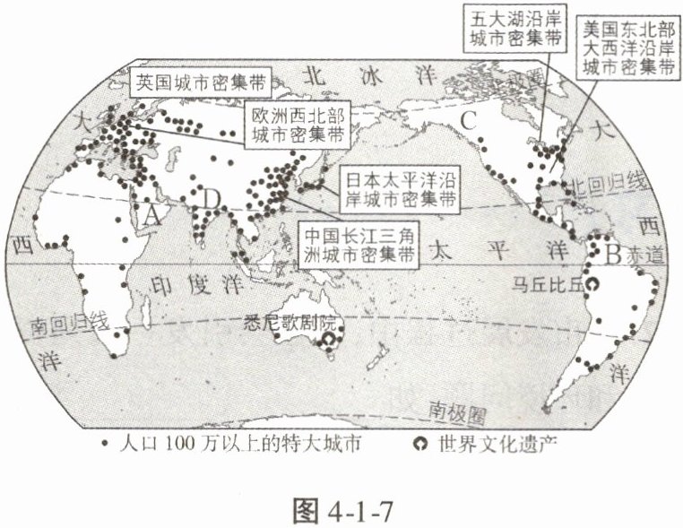 (沿海或内陆)地区。(2)说明图中 A、B、C、D 地区没有形成特大城市的主要自然原因。