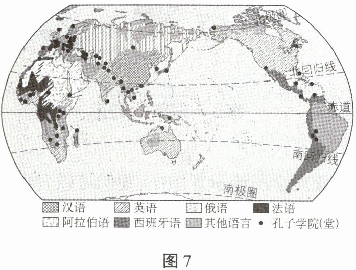 中国文化通过孔子学院在世界各地广泛传播,目前已有超过150个国家和地区建有500多所孔子学院和1 000多个孔子学堂。图7为世界主要语言及部分孔子学院(堂)的分布图,读图完成9、10题。