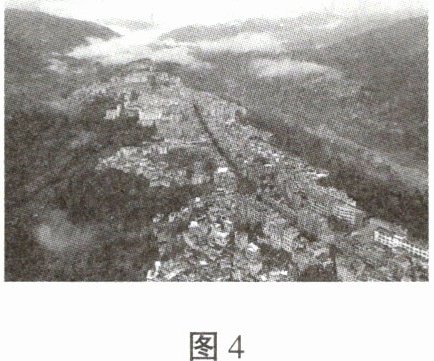 云南省绿春县城建在山脊之上,呈长条形(如图4所示),只有一条街,房子都集中在街道两边。没有十字路口,没有红绿灯。县城最窄处不足30米,最宽处也仅300米。结合所学知识,完成6、7题。