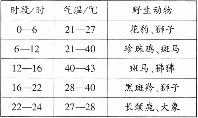 (2024·福建中考)某自然保护区内有一处人工水塘。干季时,每天都有大量野生动物前来饮水,吸引众多摄影师前往拍摄。读某自然保护区某日不同时段的气温与可拍摄到的野生动物表(表 5-2-2),完成 6—8 题。
