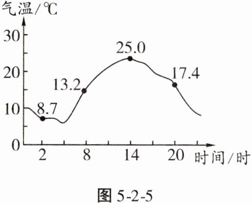 【核心素养·地理实践力】某学校地理兴趣小组经常开展观察和记录地理现象的活动,图 5-2-5 为该兴趣小组绘制的某地气温日变化曲线图。据此完成 1—3 题。