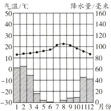 7. 根据提供的美国洛杉矶月平均气温和降水量表(表5-2-4),在坐标网格(图5-2-13)中绘出洛杉矶的气温年变化曲线和逐月降水量图。