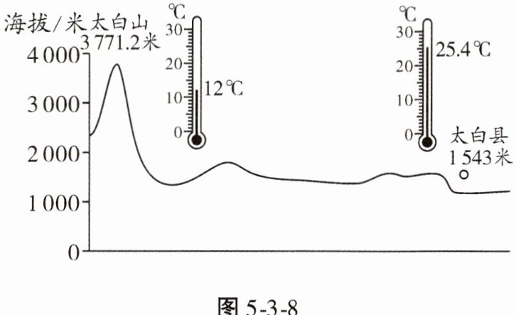 (2024·安康期末)暑假期间,小萱一家去秦岭主峰——太白山游玩,到山顶后发现山顶与山底温差很大。读太白县和太白山 7 月某日平均气温图(图 5-3-8),完成 5、6 题。