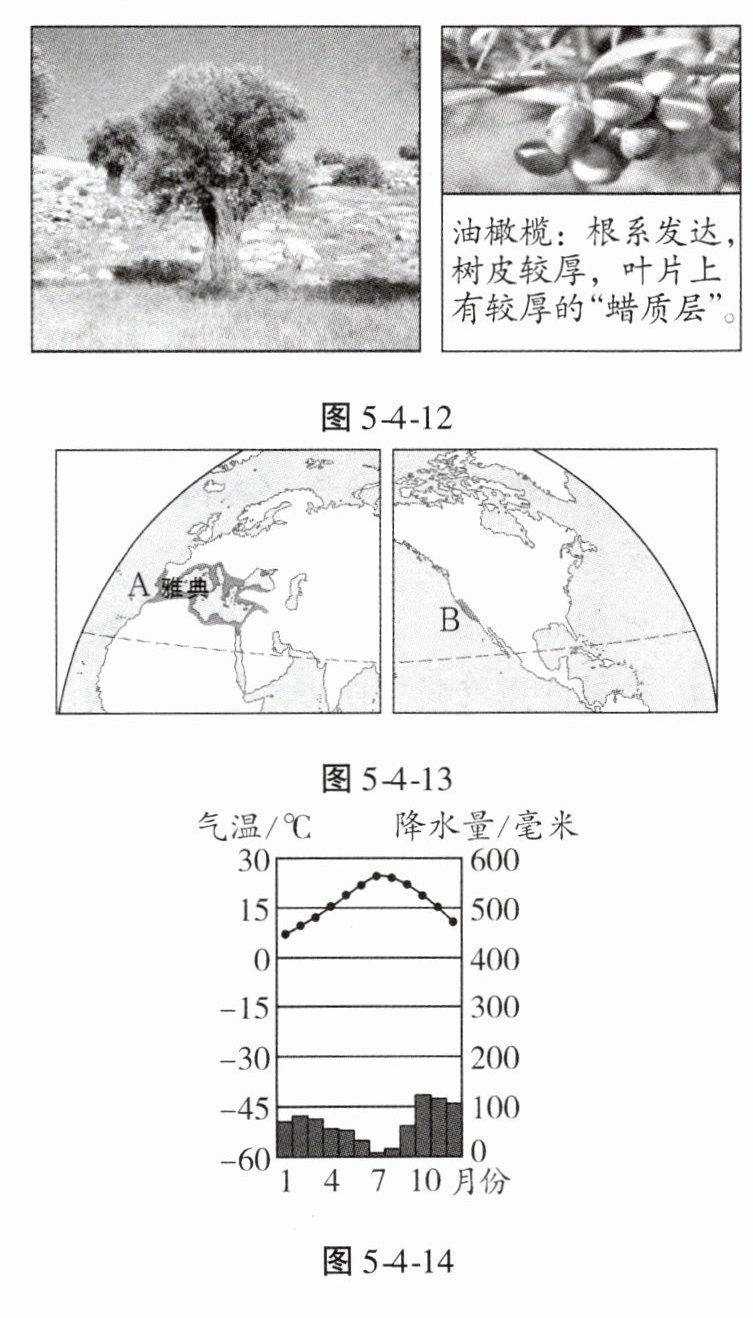 10. 【核心素养·人地协调观】地中海气候是雨热不同期的气候类型。夏季,干燥少雨,天天都是艳阳天。阳光、沙滩使地中海沿岸成为欧洲人度假的旅游胜地。这里最常见的植被是橄榄树和棕榈树,还适合种植各种耐旱水果,比如柑橘、葡萄和无花果等。读油橄榄示意图(图 5-4-12)、北半球地中海气候分布图(图 5-4-13)和雅典的气候资料图(图 5-4-14),完成下列问题。