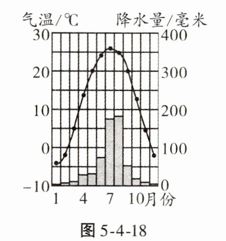 图 5-4-18 是某地气温年变化曲线和逐月降水量图,读图完成 2、3 题。