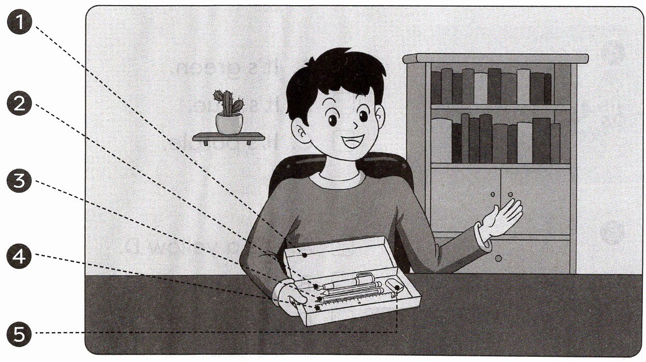 ① pencil case: blue ② pen: red ③ pencil: black ④ ruler: orange ⑤ eraser: white
