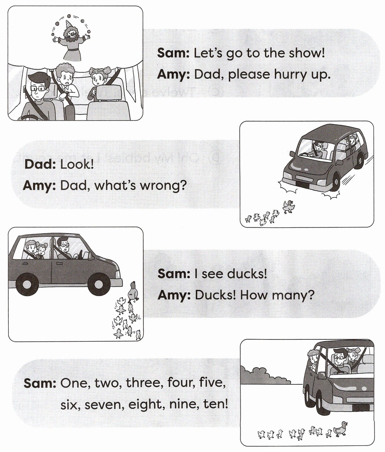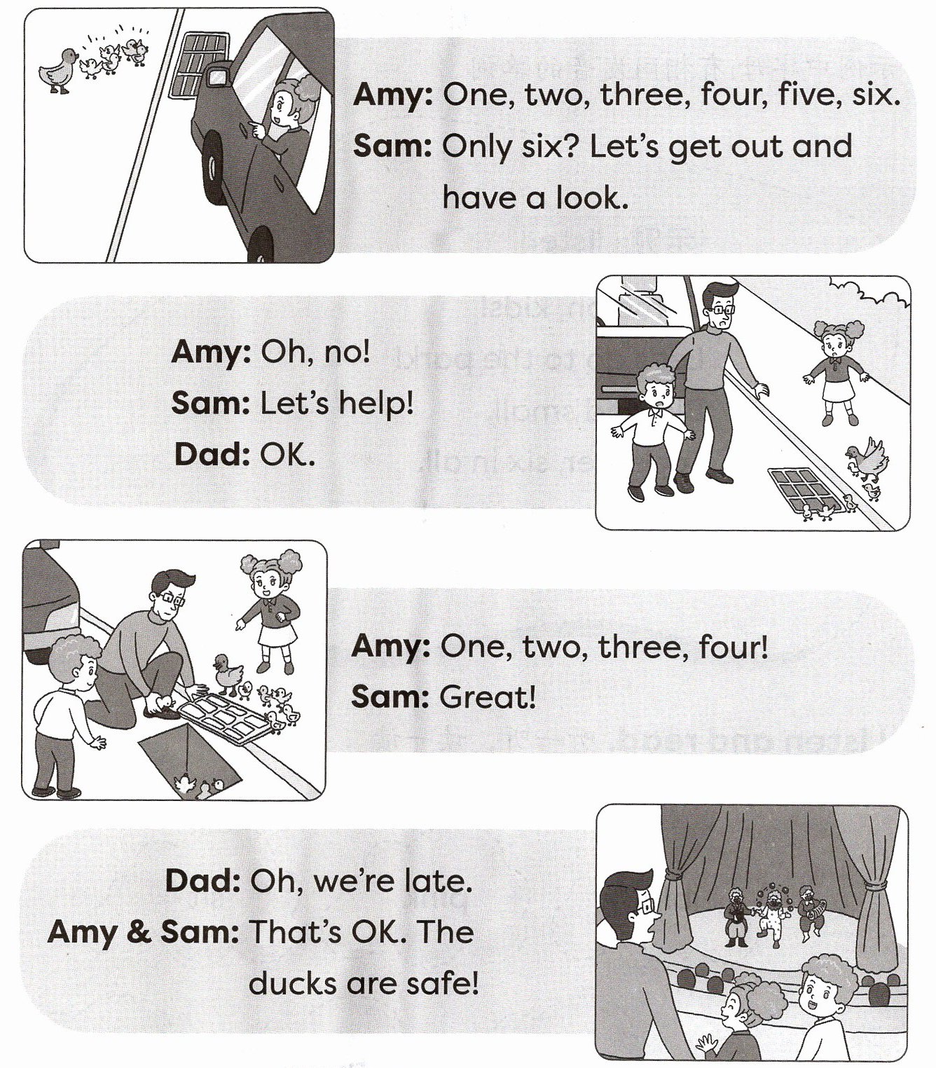 ② Amy, Sam and Dad help the ducks.