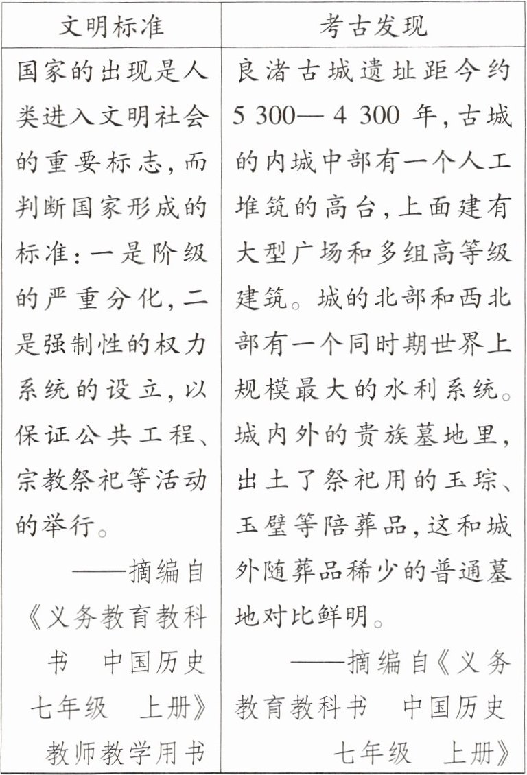 |国家的出现是人类进入文明社会的重要标志,而判断国家形成的标准:一是阶级的严重分化,二是强制性的权力系统的设立,以保证公共工程、宗教祭祀等活动的举行。——摘编自《义务教育教科书 中国历史 七年级 上册》教师教学用书|良渚古城遗址距今约 5 300—4 300 年,古城的内城中部有一个人工堆筑的高台,上面建有大型广场和多组高等级建筑。城的北部和西北部有一个同时期世界上规模最大的水利系统。城内外的贵族墓地里,出土了祭祀用的玉琮、玉璧等陪葬品,这和城外随葬品稀少的普通墓地对比鲜明。——摘编自《义务教育教科书 中国历史 七年级 上册》|