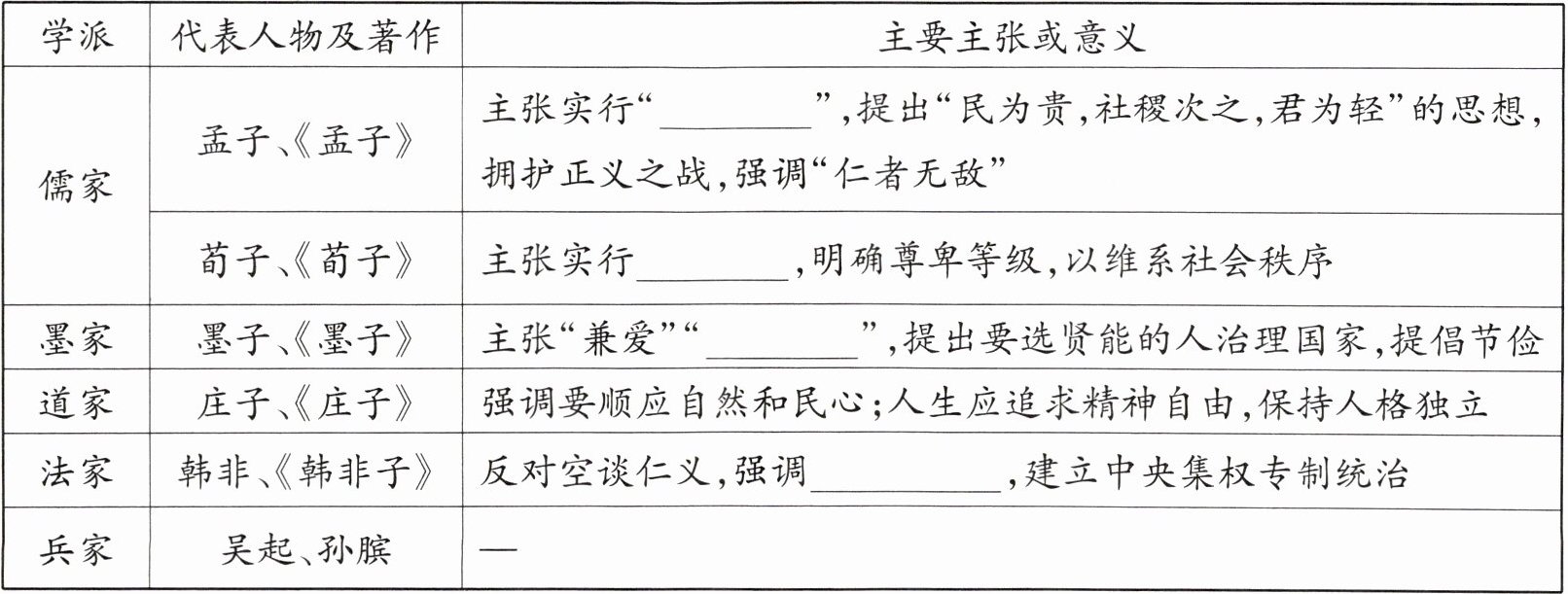 |儒家|孟子、《孟子》|主张实行“______”,提出“民为贵,社稷次之,君为轻”的思想,拥护正义之战,强调“仁者无敌”|