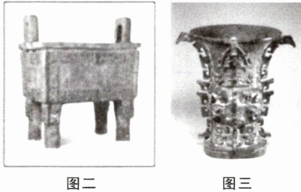 (3) 图二、图三是商朝青铜器的代表作,它们的名字分别是什么?结合材料及所学知识,谈谈你对商代灿烂青铜文明的认识。