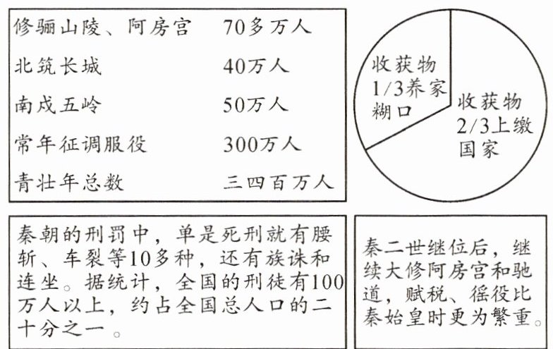 |秦朝的刑罚中,单是死刑就有腰斩、车裂等10多种,还有族诛和连坐。据统计,全国的刑徒有100万人以上,约占全国总人口的二十分之一。|
