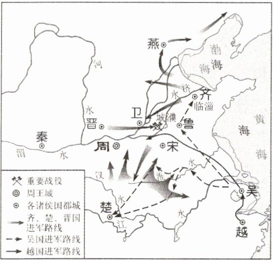 C 【解析】据图片看出,当时有晋、齐、鲁、吴、越、宋等诸侯国,吴越争霸发生在春秋末年,战国初年韩、赵、魏三家分晋。图片反映的是春秋争霸。C符合题意。