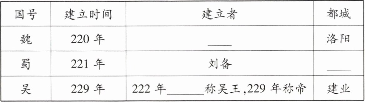 | 吴 | 229年 | 222年______称吴王,229年称帝 | 建业 |