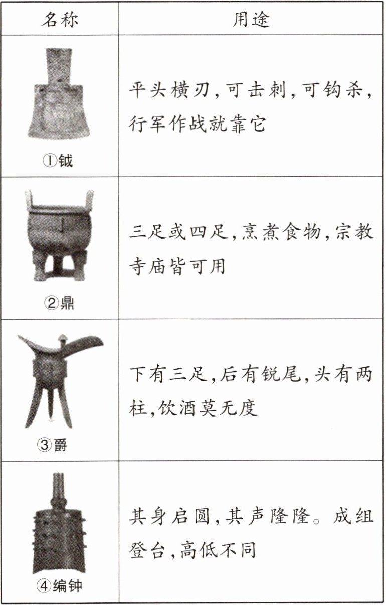 (2)用途:兵器、食器、酒器、礼器、乐器。