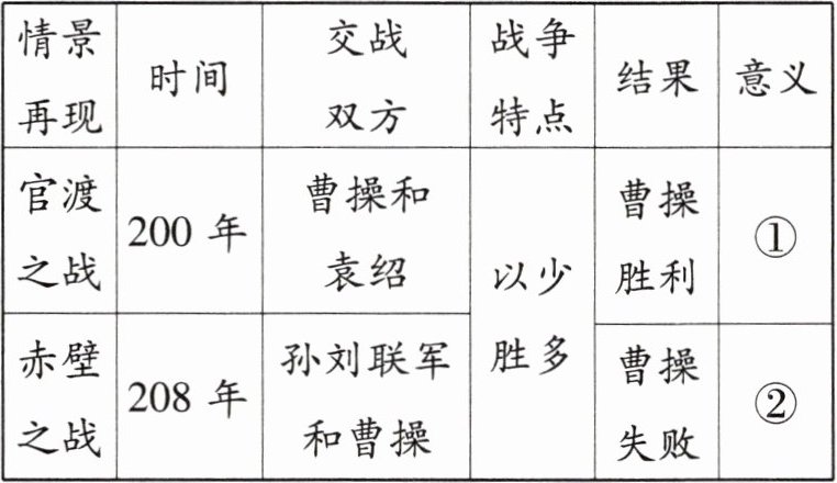 | 官渡之战 | 200年 | 曹操和袁绍 | 以少胜多 | 曹操胜利 | ① |