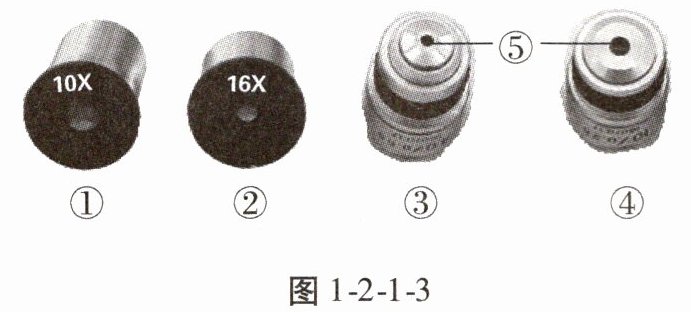4. (2024·陕西中考)显微镜配置的物镜放大倍数为 10×、40×。图 1-2-1-3 中①②是目镜、③④是物镜,物镜镜头上⑤的直径越大,通过光线越多,视野越亮。显微镜放大倍数越大,观察到的视野越暗。视野中,细胞数量最多的组合是( )