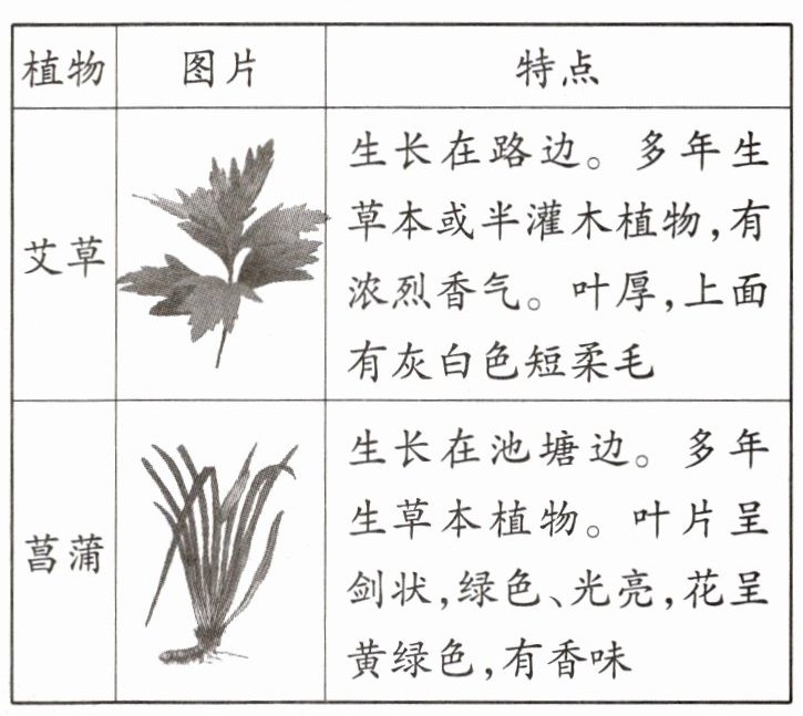 10. 【传统文化】“清明插柳,端午插艾。”人们常把艾草和菖蒲称为端午植物。人们在端午这一天扫庭院、挂艾枝、悬菖蒲、洒雄黄石、饮雄黄酒、激浊除腐、杀菌防病,可以说端午节也是自古相传的“卫生节”。表 1 - 1 - 1 - 2 是某同学有关端午植物的观察记录表。