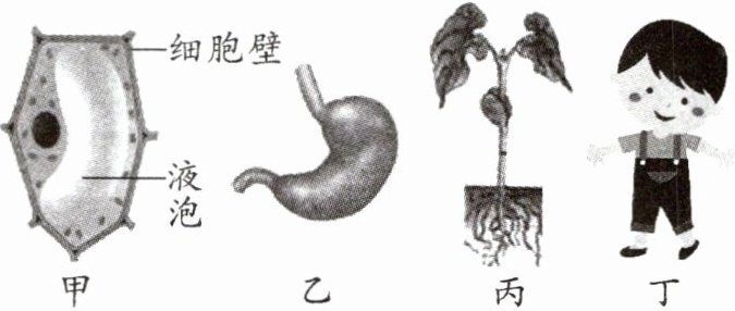 B.乙所示的胃和丙中的叶属于同一结构层次——器官