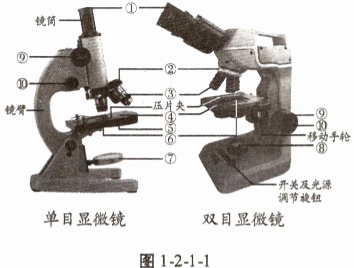 1. 实验室中常见的光学显微镜有单目显微镜和双目显微镜。它们的构造如图 1-2-1-1 所示: