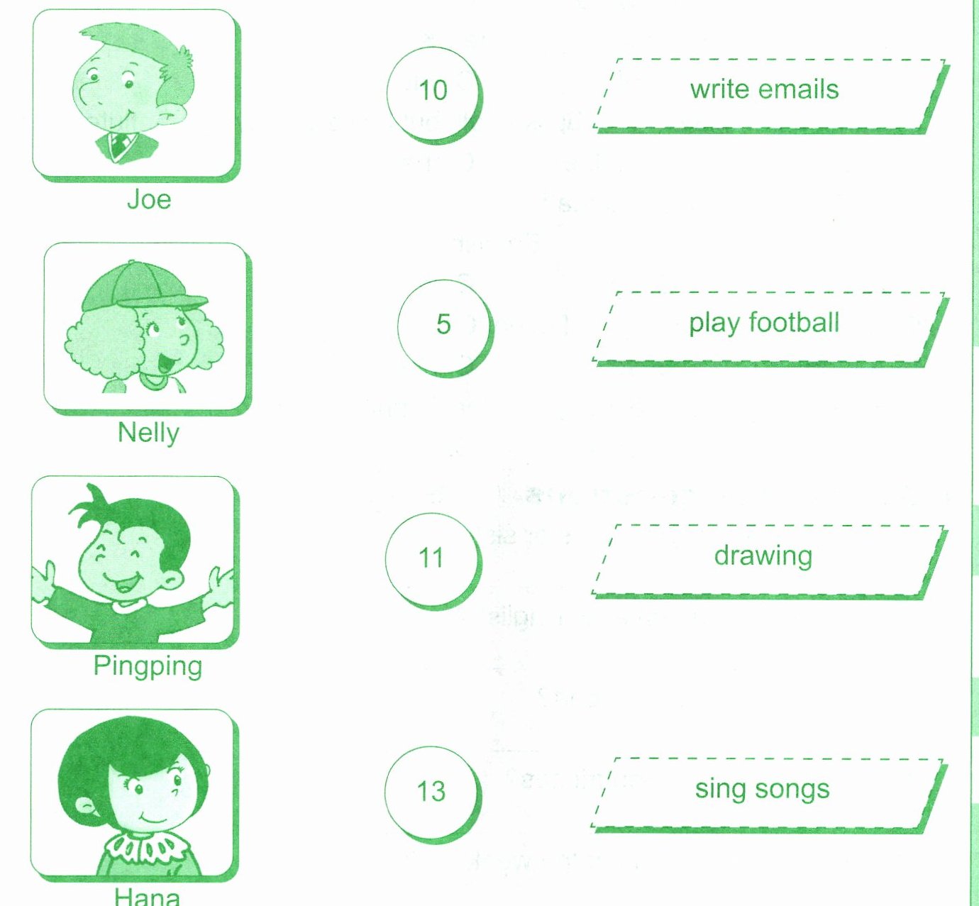 1) Joe—11—play football. 2) Nelly—13—drawing 3) Pingping—10—write emails 4) Hana—5—sing songs