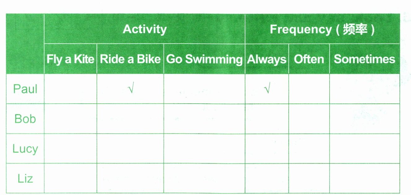 Bob: fly a kite, sometimes Lucy: ride a bike, always Liz: go swimming, often