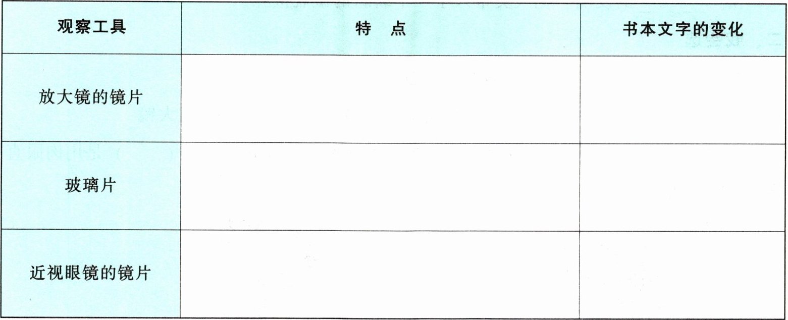 实验 观察比较放大镜的镜片、玻璃片和近视眼镜的镜片,把观察结果记录下来。
