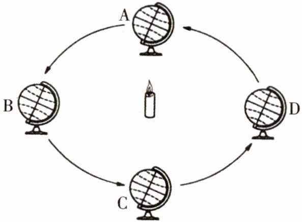 实验方法:用一支蜡烛代替太阳,用一个小地球仪代替地球,让小地球仪按如图方式绕蜡烛转动。