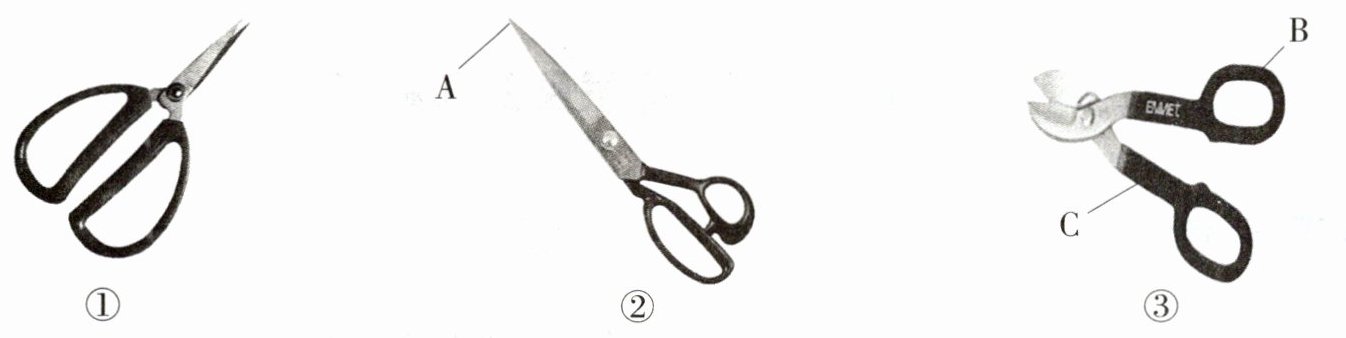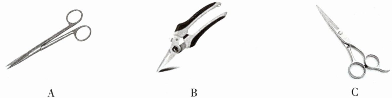 小明学习了”剪刀”这一类工具后,他找来如图所示的三种类型的剪刀,请你仔细读图,并帮助小明完成下面的题目。
